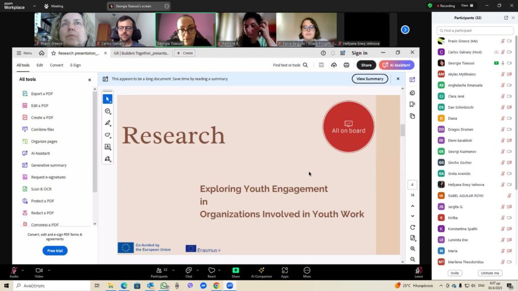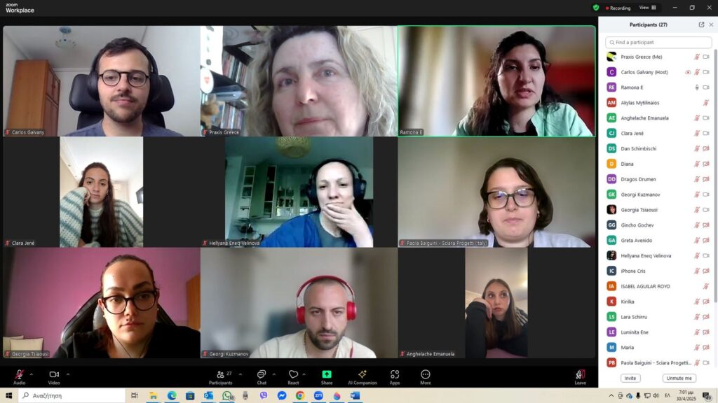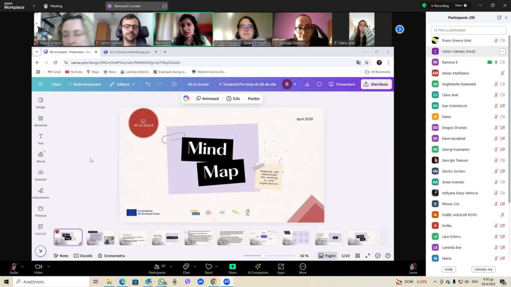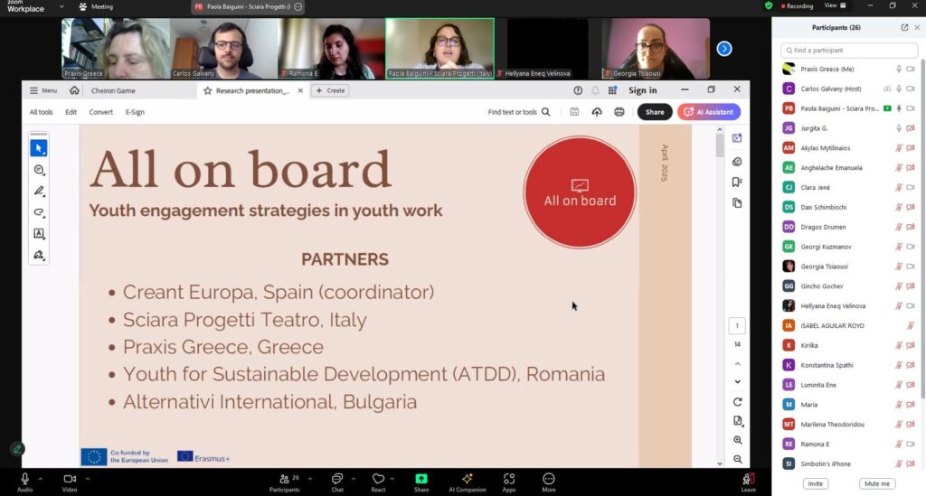 As part of the Erasmus+ KA2 project titled “All on Board – Youth Engagement Strategies in Youth Work,” an online training session was successfully organized at the end of April, involving participation from all partner countries: Spain, Greece, Italy, Romania, and Bulgaria. This collaborative effort aimed to foster dialogue around non-formal education methodologies, facilitate the exchange of good practices among young people and youth organizations, and share practical tips and strategies for effective youth engagement.