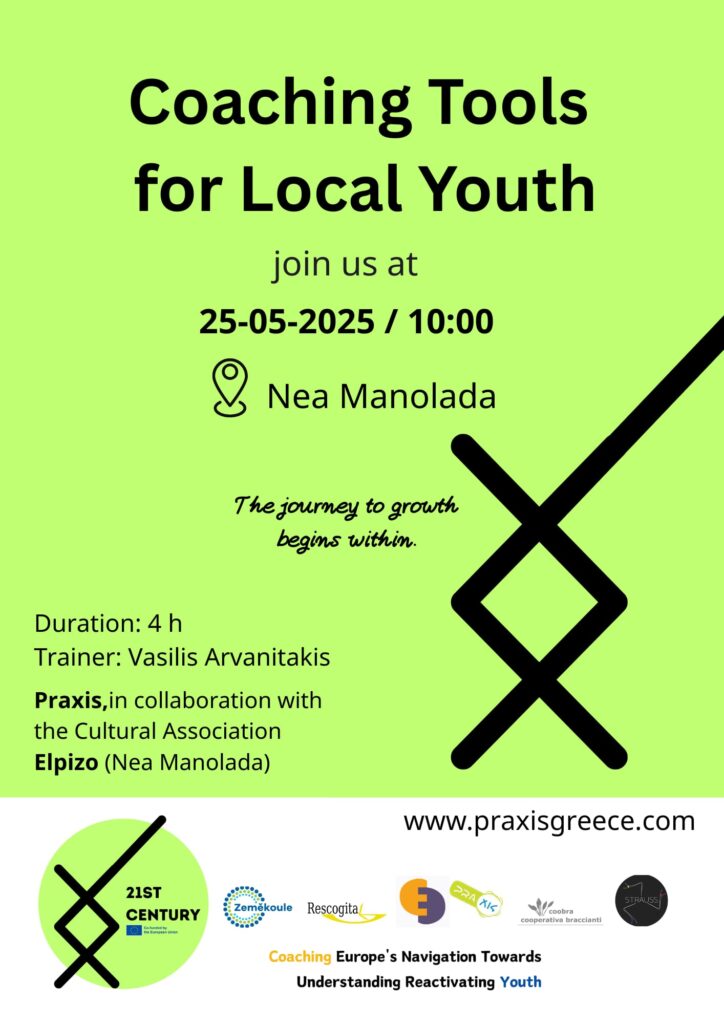 This activity was implemented within the framework of the long-term training course project on social coaching for youth workers, entitled “21st Century.” The implementation of this local training in Nea Manolada ( Greece) was an initiative I undertook as a participant of the “21st Century” project. As an active citizen of this local community and a member and volunteer of the Cultural Association ̈Elpizo ̈, I aimed to bring the project’s values and methods closer to the local context.