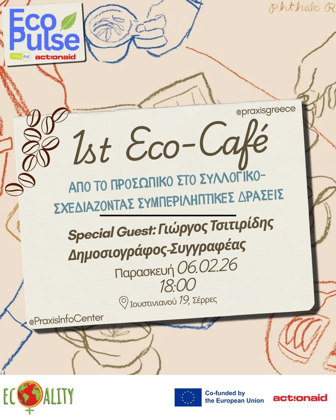 Η συνάντηση πραγματοποιείται στο πλαίσιο του προγράμματος Eco_Pulse/ ECOALITY με την συνεργασία της Action Aid, το οποίο στοχεύει στην ενδυνάμωση και την κινητοποίηση των νέων της πόλης των Σερρών ως φορέων αλλαγής για την κλιματική και την έμφυλη δικαιοσύνη. Μέσα από δράσεις διαλόγου, εκπαίδευσης και συλλογικού σχεδιασμού, το Eco_Pulse επιδιώκει να καλλιεργήσει μια νέα γενιά ενεργών πολιτών με οικολογική και κοινωνική συνείδηση.